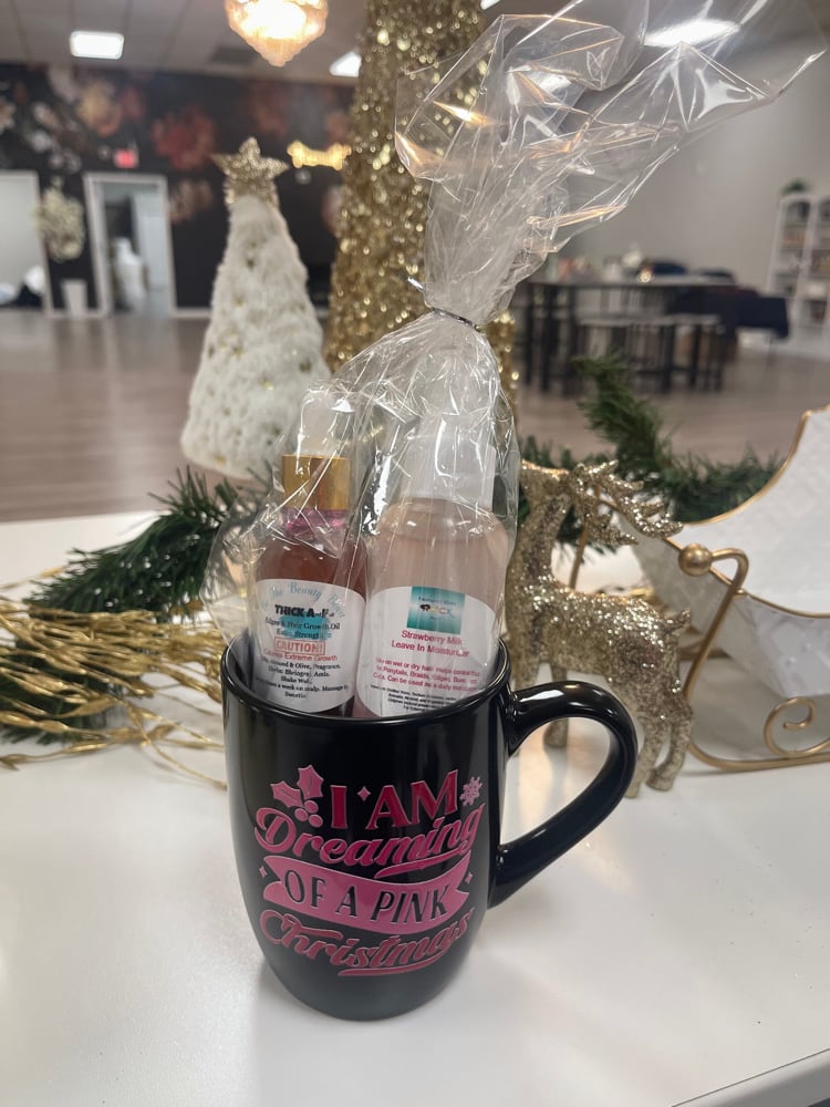 Pink Christmas? I will take it! Choose between just the mug, the mug with a bottle of Bring it Back Spray and Thick AF or a self care mug with F Them Kids Bath Salt and Grownup Candy.